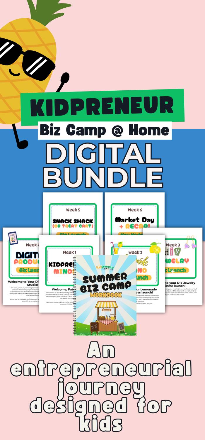 The 6-Week Kidpreneur Biz Camp @Home is a hands-on, self-paced experience that helps kids explore real business ideas from lemonade stands to digital product design while building the confidence, creativity, and money smarts they need to THRIVE in any economy.